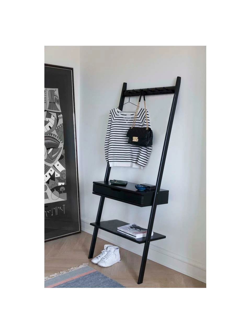 Étagère murale/échelle avec un tiroir, un compartiment de rangement et 6 crochets