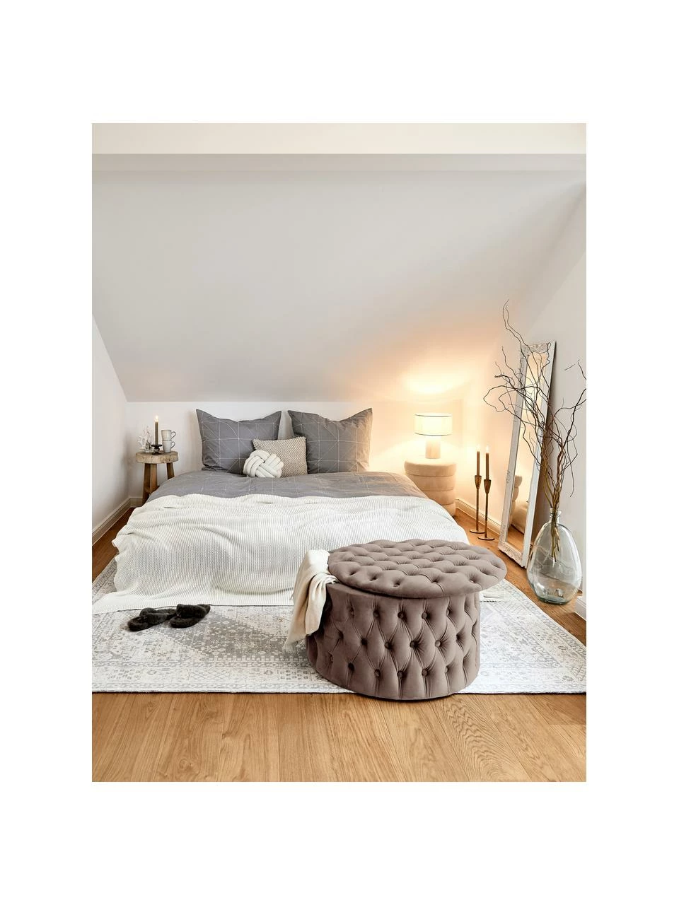 Que ce soit pour poser ses pieds ou comme siège supplémentaire pour les invités : Chiara est polyvalent et offre beaucoup d’espace de rangement. Couvertures, coussins et vêtements disparaissent sous le couvercle en un rien de temps. Nous aimons particulièrement la couverture en velours doux et les boutons décoratifs