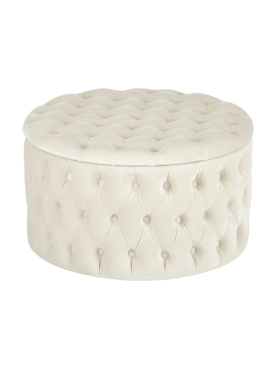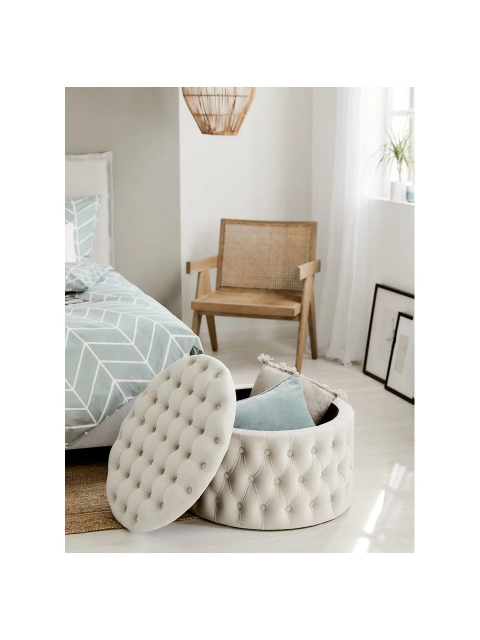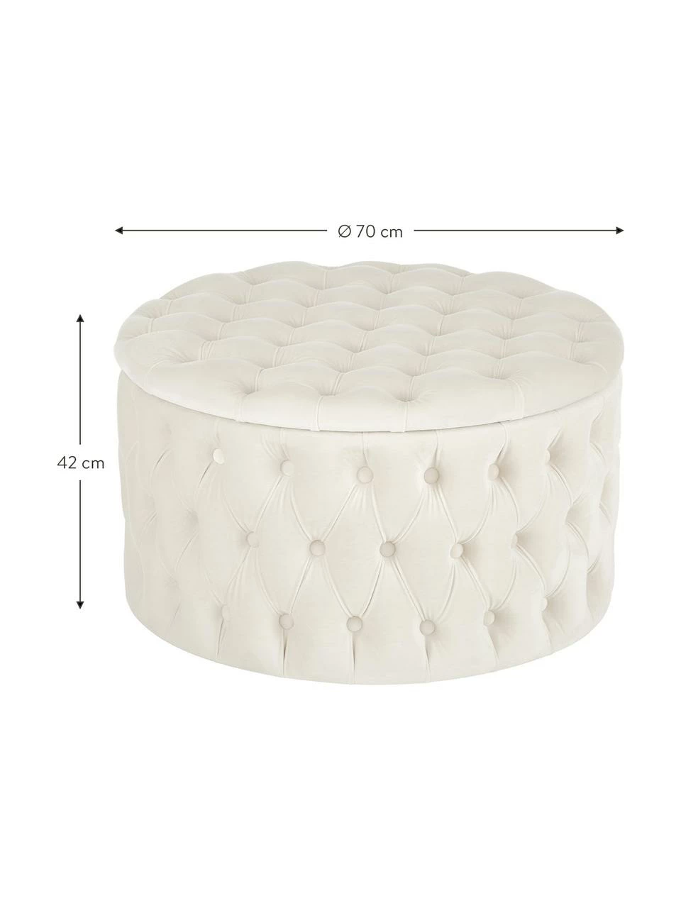 Que ce soit pour poser ses pieds ou comme siège supplémentaire pour les invités : Chiara est polyvalent et offre beaucoup d’espace de rangement. Couvertures, coussins et vêtements disparaissent sous le couvercle en un rien de temps. Nous aimons particulièrement la couverture en velours doux et les boutons décoratifs