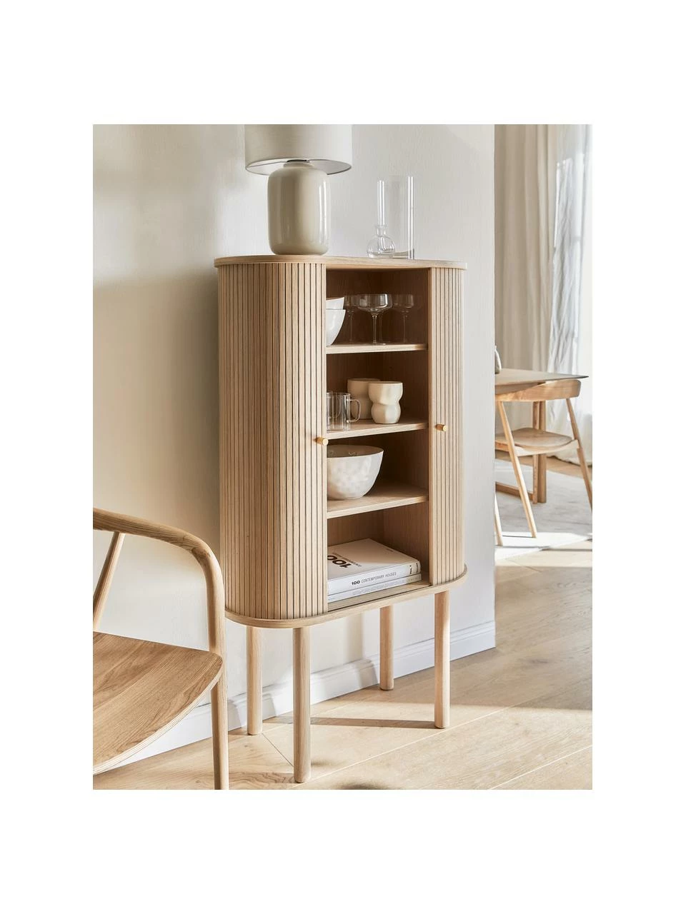 La structure cannelée décorative orne les façades des portes et fait de ce produit un véritable point fort du design qui attire tous les regards ! Les pieds filigranes confÚrent en outre au design un aspect minimaliste et épuré